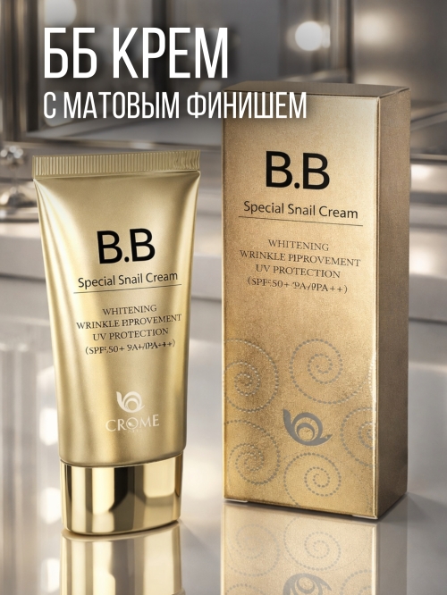 Солнцезащитный ВВ-крем - корректирующее уходовое средство с улиточным муцином. Crome Snail B.B Cream увлажняет, обеспечивает идеальное покрытие, скрывает недостатки и несовершенства кожи. Крем содержит мощный солнцезащитный блок SPF50+ PA+++, который нейтрализует агрессивное воздействие UVA/UVB ультрафиолета на кожу, защищает её от ожогов, пересушивания и раннего старения. Эффективно маскирует многие виды несовершенств. Он помогает скрыть пигментации, бугристость и неровность, заполнить морщины, выровнять тон лица и улучшить его цвет. Распределяется по коже легко, обладает осветляющим эффектом, за счет содержания в составе ниацинамида.